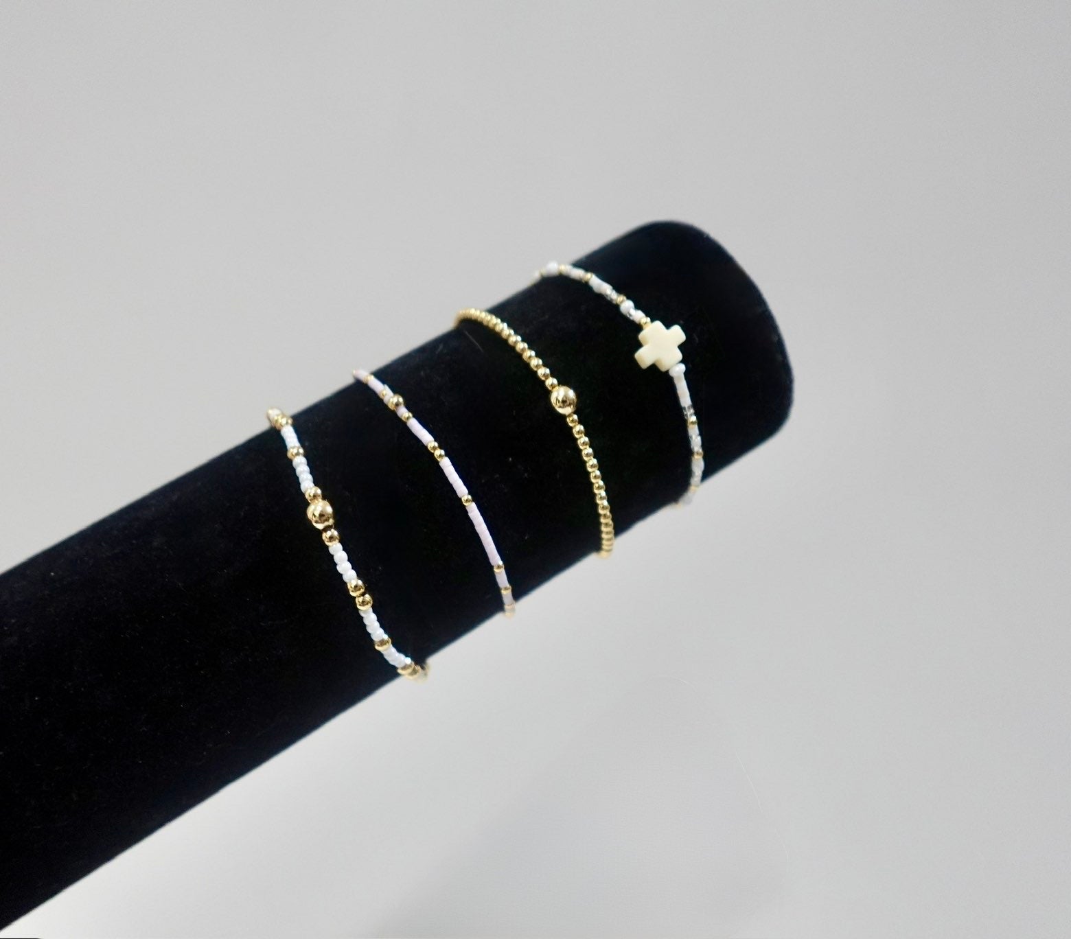 The Dear Darling Bracelet Stack combines lustrous gold and elegant white beads across four coordinated bracelets, designed to layer beautifully or wear individually. Each piece in this curated set features quality craftsmanship, allowing you to create a personalized wrist aesthetic that transitions seamlessly from day to evening. Mix, match, and stack to express your unique style with versatile sophistication.